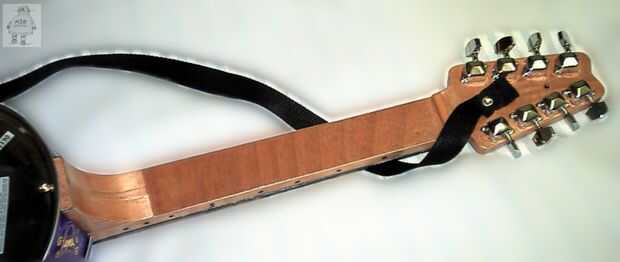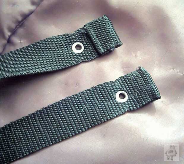 También hice una correa, de algunas correas. Doblar el extremo y coser para evitar que se deshilache, luego poner un ojal a través de una arandela (en la parte trasera) y doble hacia abajo. El tornillo de la cola existente debe pasar por un extremo, y un tornillo de corte en la parte posterior de la pala proporciona un segundo punto de anclaje.