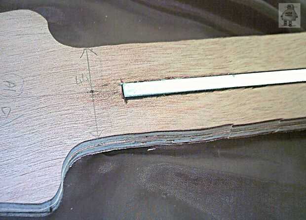 Una ranura para un ajustable no "alma" va en la pieza media de la pila. Porque la barra de acero es un poco más gruesa que la madera contrachapada, una leve muesca debe ir en la pieza superior de la madera. Esta muesca debe ser un apretado ajuste de la barra longitudinal, de lo contrario realmente no ayudan a mantener el cuello recto y podrían vibrar!