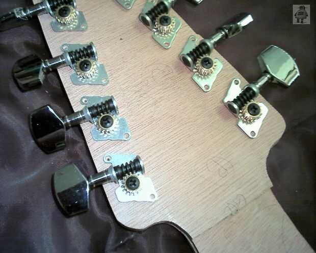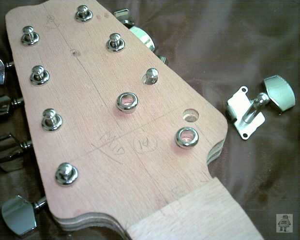 Los afinadores están montados por perforación piloto derecho pequeño agujero a través del cabezal, entonces usando una broca forstener desde el frente. Este agujero tiene que ser una buena presión para las virolas del sintonizador, antes de perforar un agujero más pequeño de la parte posterior para la entrada del sintonizador. Una broca forstener da un agujero redondo limpio agradable con un fondo cuadrado. Prueba en un trozo de madera contrachapada para asegurarse de que el ajuste es correcto!