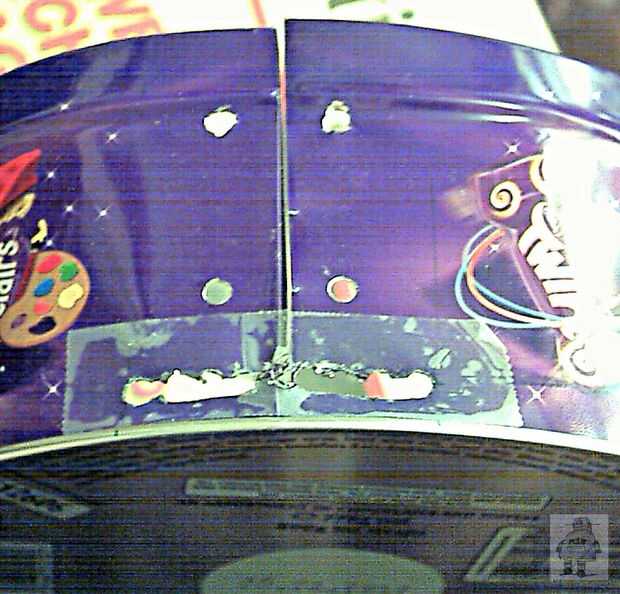 El cuerpo es una lata de chocolate acero. Consumir todos los chocolates, primero marcar las líneas de plegado de donde vendrá el cuello. Elegí la costura de la lata la zona de destrucción. El cuello será de unos 50mm de ancho aquí. Perforé una línea de agujeros a través de separar el estaño (podría poner un agujero de inicio y vio esto, o dremel en todo pero no no resbale!) antes de poner en cuatro orificios de montaje utilizados para enroscar la lata sobre el bloque de talón con tornillos No 8.