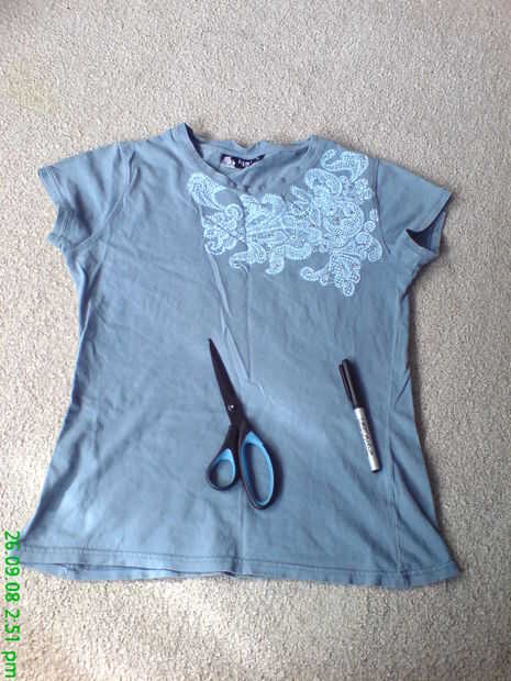 tiene un viejo o sobre tamaño de camiseta? Bueno... Qué esperas for...go convierten a este sexy... y lindo top!lo que hace lindo?? bueno creo que la ric rac rosa es tan linda y que le da un toque lindo :-DPaso 1: materiales la máquina de cosersobre t