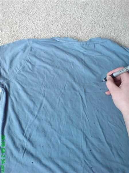 Si quieres precisión, coge su pluma y dos filas de puntos en la parte posterior de la camisa para indicar donde está cortando desde y hacia la marca.