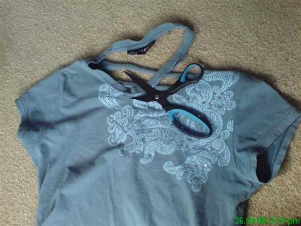 estos tienen algunas de mis camisetas de verano favorito.Déjame mostrarte qué hacer...Paso 1: Conseguir una camiseta viejaPaso 2: Cortar las mangas Ver foto de las instrucciones:Paso 3: Cortar el escote Paso 4: Cortar la parte trasera Paso 5: Hacer l