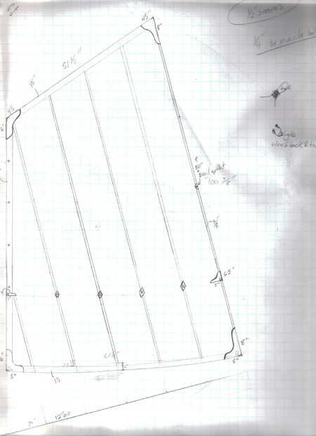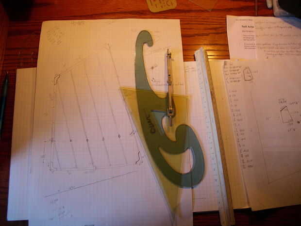 Para bosquejar hacia fuera la vela necesita conocer algunas medidas básicas. Por ejemplo yo sabía que quería el luff, el lado al lado del mástil, al ser 6 pies de altura. Por lo tanto, basado en una fórmula en mi libro, puedo averiguar las otras mediciones.