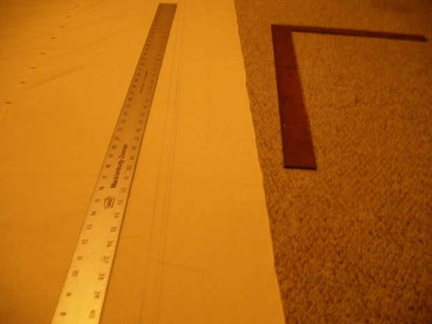 Con un carpintero cuadrado medida en la vela de la sanguijuela y marque una línea de cabeza a los pies de 11 y 1/2, 12 y 12 y 1/2 pulgadas. Doble a lo largo de la marca de 12 pulgadas para que el 11 y 1/2 y 12 y 1/2 pulgadas marca satisfacer. Poner alfileres en a lo largo de la costura.