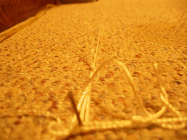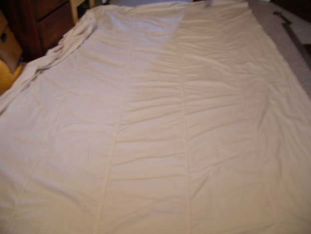 Una vez que se ha establecido el contorno de la vela en el piso, colocar su material. Comience con el borde de orillo contra la cadena externa sanguijuela que ha trazado. Estire la tela hasta que va más allá de la cabeza y el pie por lo menos 6 pulgadas. Luego cortar a la tela y ponga el resto en el borde de lo que sólo establecidas.