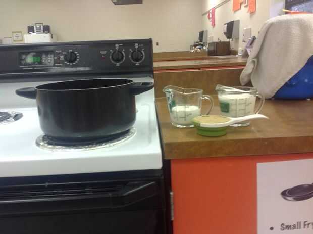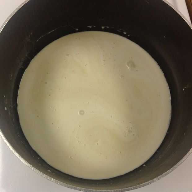 1 1/2 tazas de crema (no todos) y 1/2 tazas de azúcar morena (no todos) se combinan en una cacerola mediana. Revolver de vez en cuando a fuego medio hasta que se formen burbujas alrededor de los lados.