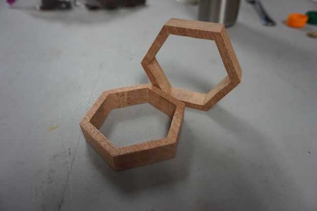 Más simple, pero más delicado hacía las paredes internas. En primer lugar creé dos anillos hexagonales de caoba por impresión de la forma sería hecha en Illustrator, fijar el papel a un bloque de madera con spray adhesivo y luego cortarlo hacia fuera en una sierra de contornear. Se necesita práctica para obtener lo suficientemente precisa para esto.