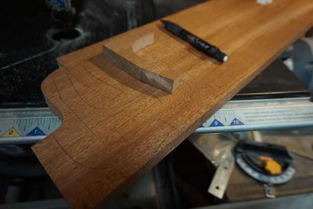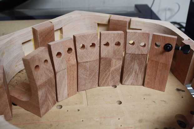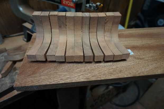 Usando la forma que había creado en mi documento de Illustrator, cortar las doce piezas del cuello y había pegado en pares. Como con los apoyos internos, usé la lijadora de banda para alisar las irregularidades, hasta que parecían un solo bloque de madera.
