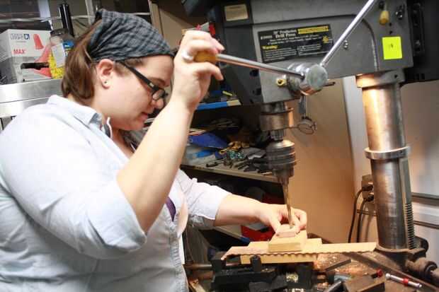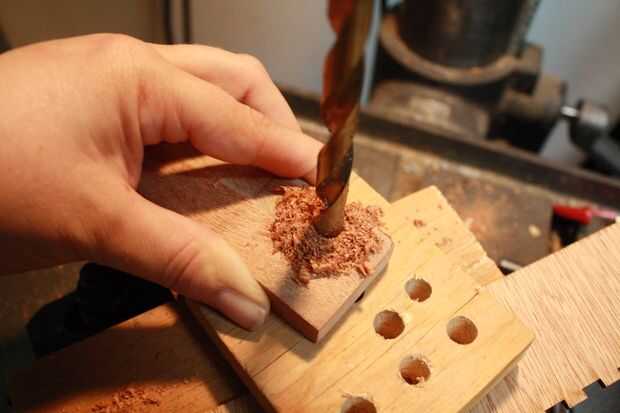 El siguiente fue perforar los agujeros para las clavijas de afinación, que deben ser apretado. Comencé por hacer el agujero un poco pequeño y aflojar después para arriba con una herramienta giratoria dremel y tambor de lijar que poco.