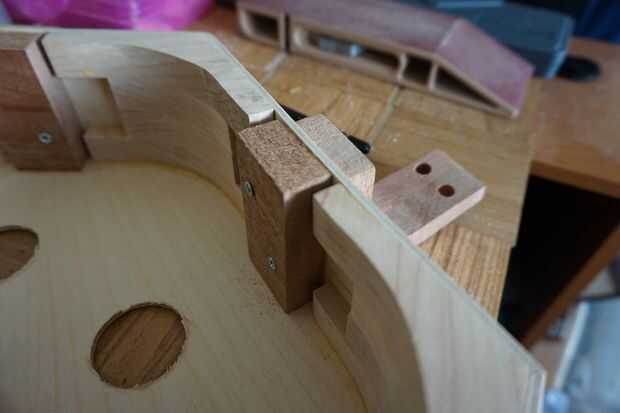 Fijación al cuerpo del instrumento se realizó con la cara hacia abajo, para asegurar que sea alineada con la cara. Pegué, apriete un poco y luego enroscar en el cuello desde el interior del bloque del cuello para asegurar un poco más.