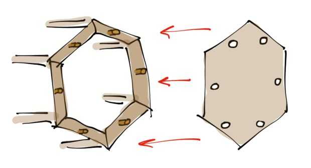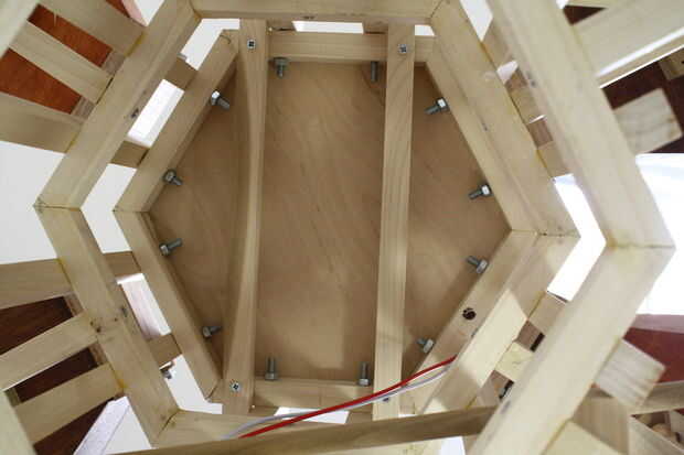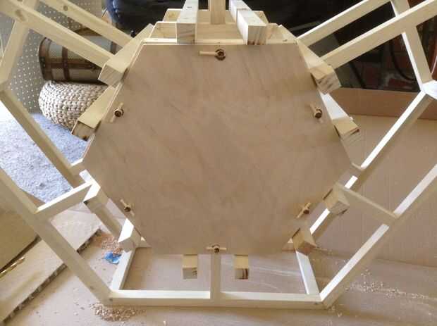 La placa delantera del Hexachord es un simple pedazo de madera contrachapada, medido y cortado para que coincida con el pequeño hexágono formado por la parte delantera del bastidor. Para adjuntarlo y que sea fácilmente desmontable, perforar los agujeros para las clavijas y había pegado las clavijas en el marco. Coincidencia de los agujeros en la placa le deslice en y asegúrelo con los pinchos a través de las clavijas.
