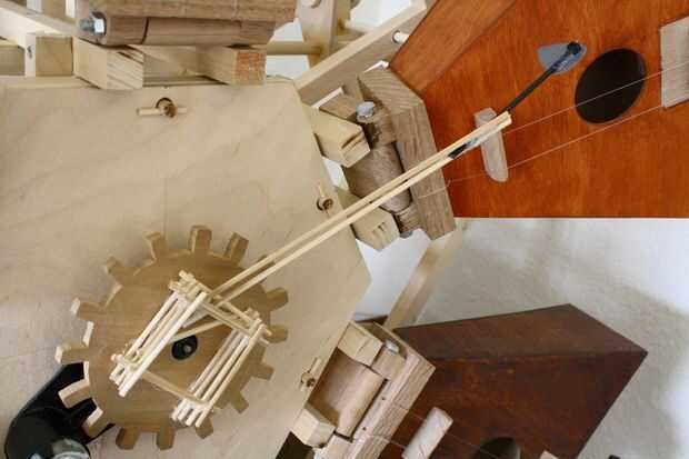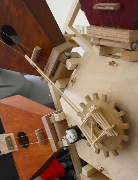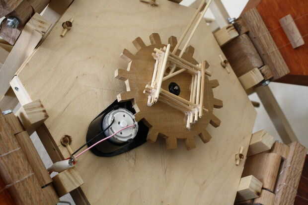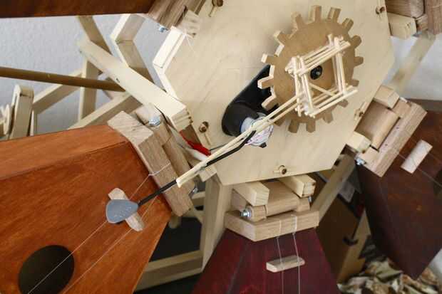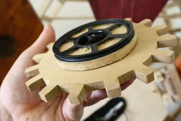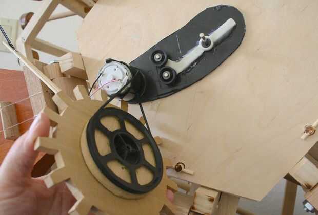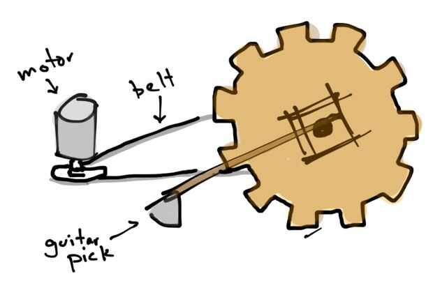 El motor fue rescatado de un Rebobinador de cinta de video. Vino con una conveniente correa y la polea, a la que os adjunto la base de brazo de plectro – un engranaje de madera cortados a mano había hecho un par de meses antes y estaba muriendo para utilizar. Mi pensamiento original era perforar el engranaje en ángulo y fije el brazo en el, pero terminó siendo más factible construir una estructura de palillos de bambú que apoye la posición del brazo. Por un lado, era más fácil de ajustar, y por otra parte, que simplemente como edificio con pinchos de bambú.