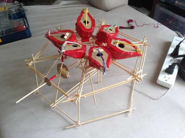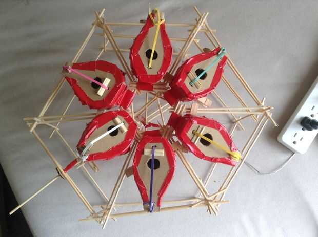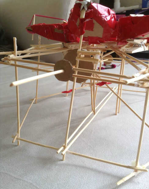Algunos de mis materiales favoritos para prototipos rápidos incluyen brochetas, pegamento, cartón y bandas de goma. (Tengo un post más detallado en mi blog sobre materiales trasteando y prototipos, si te interesa). Con el fin de transmitir la idea de este instrumento y para ayudar a solidificar el concepto en mi cabeza, hice una versión pequeña (tamaño 1/3). Gente de Crashspace no parece comprender que era una versión pequeña hasta que no sacó las primeras partes de la estructura, que es - nos engañemos - grande.