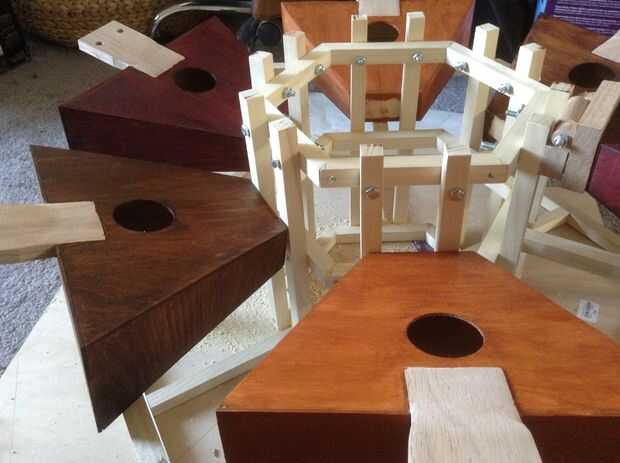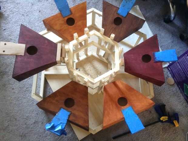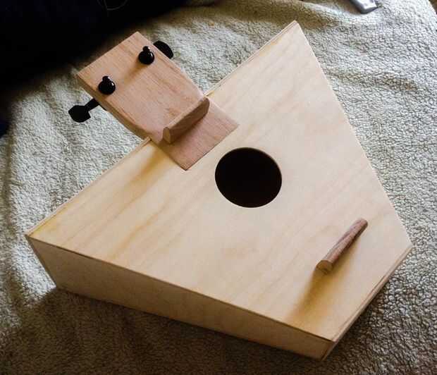 Como ya he mencionado, he probado un par diferentes formas para estos. Mi idea original era que una forma bonita, curvas tipo laúd. Se hizo evidente, que la construcción de esta forma sería mucho más complicada de lo que estaba buscando en una primera versión de este instrumento. En definitiva, y puesto que me gustaba la forma y el sonido, aterricé en un diseño de lados rectos más cerca a una balalaika. Esto era un natural de ajustarse a la forma del conjunto y ayudó a destacar el tema del hexágono.