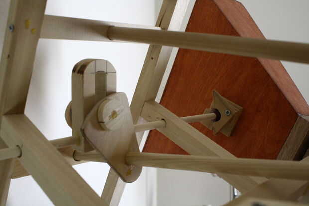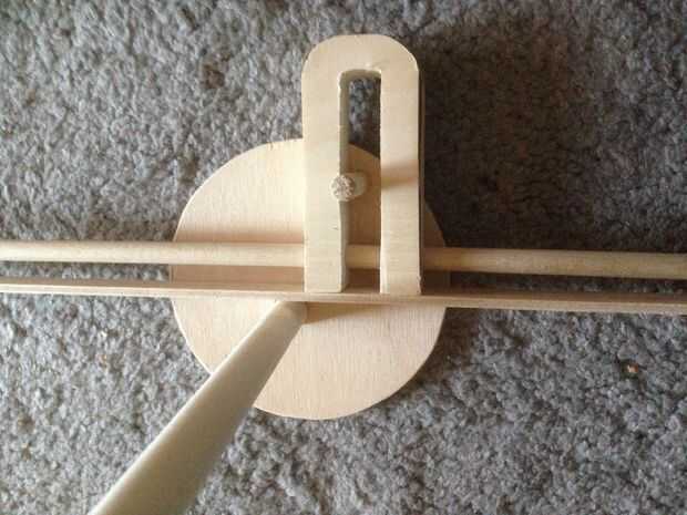 Quería ser capaz de controlar la posición de cada cámara de sonido desde el mismo lado. No bailar alrededor para hacer que funcione (aunque eso podría ser divertido también). Como movimiento de rotación es bastante fácil de traducir a largas distancias, decidí utilizar una perilla para cada cámara de sonido conectado a través de clavija a un scotch yoke mecanismo. Es muy eficiente para convertir el movimiento rotatorio a lineal. Hay un disco, pinzas y un yugo en forma de U, a tacos colocados en ángulo recto entre sí. Puede ver una serie de dibujos en las fotos para este paso.