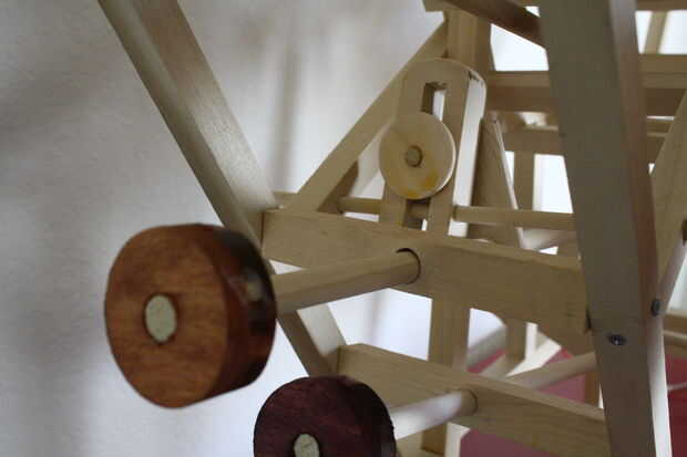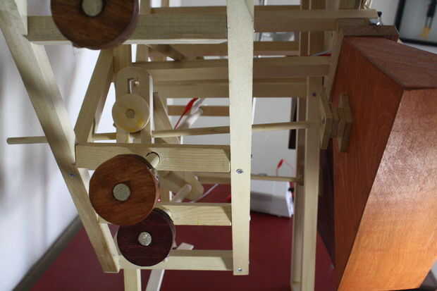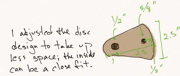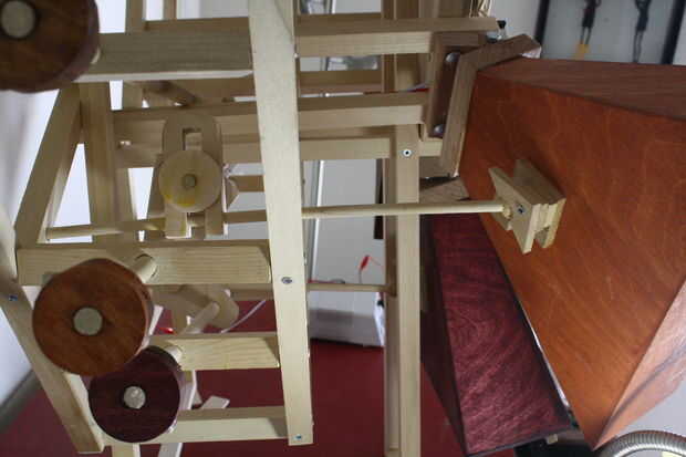Los pomos (que fueron cortados en un taladro con broca hueca) fueron teñidos para que coincida con sus cámaras de sonido asociados (por lo que se puede decir que se está moviendo) y se colocaron en el lado izquierdo. Era un poco de una tarea de maniobrarlo para caber, y terminé modificando la forma del disco (como se puede ver en mis dibujos). Pero el trabajo pagado. Cada mecanismo efectivamente convierte su movimiento rotativo a los mecanismos de yugo colocados detrás de cada cámara de sonido y les sale donde se puede reproducir.
