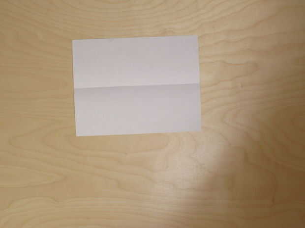Esta parte es simple. Dobla el papel por la mitad en el lado estrecho, pliegue (perro caliente), y luego revelar. Voltee el papel y doblar a lo largo del pliegue en la dirección opuesta. Dejarlo así y continuar con el siguiente paso.