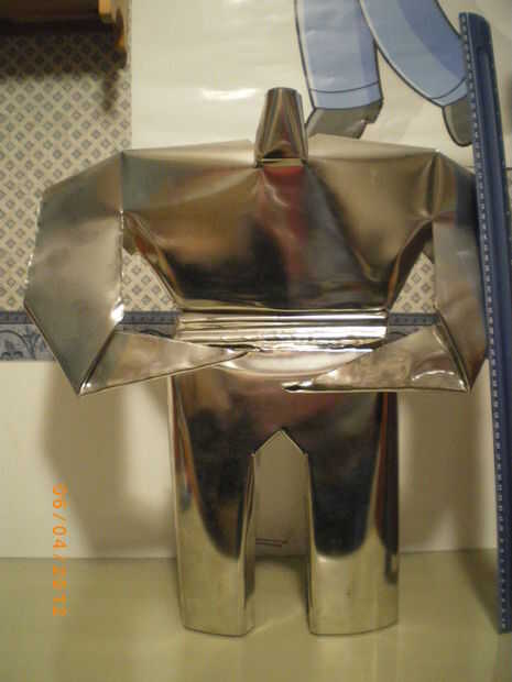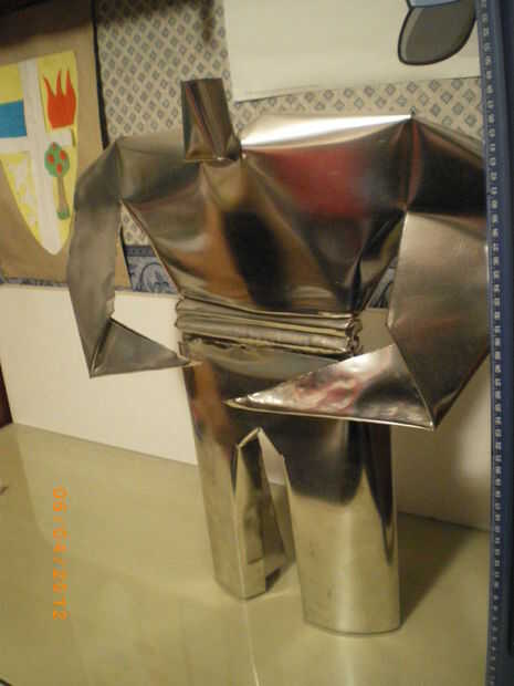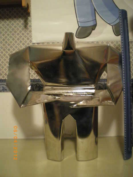 hizo este hombre de metal de espesor chapa metálica (aluminio) con ideas de origami. Hice muchos prototipos de papel antes de mano para decidir qué diseño funcionaría mejor para esta escultura final. Él está hecho de 3 partes que soldó juntos (la parte superior del cuerpo, el estómago y la parte inferior del cuerpo), el resto (cabeza, brazos, piernas etc.) todos se dobla (y martillado) como si fuese papel (te puedo decir sin duda no se sentía como el papel cuando lo estaba haciendo :)). Este chico es de unos 50 centímetros de altura y es muy brillante - mientras que en el sol;). Es una estructura dura pero divertida:).