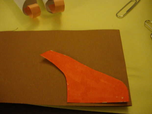 Poner pegamento en la parte exterior de cada pierna y hacerlas rodar juntos y mantener en su lugar con un clip para papel. Colocar pegamento en el interior de la zapatilla y pegamento en la pata y unir las piernas.