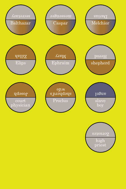 Comencé por organizar los caracteres en una hoja de cálculo, por lo que pude asociar cada carácter en una pieza con un personaje que sería simultáneamente en el escenario con. El extremo, tuve que romper esta regla en una sola pieza - el Zorastes / pedazo de sumo sacerdote. Pero, totalmente funcionado de todos modos ya que aunque los dos son en el escenario al mismo tiempo, Zorastes es visto por primera vez cuando exclama el rey Herodes, "Zorastes, ¿qué estás haciendo allí? Veo que esconde detrás de las faldas del sumo sacerdote." Así, durante la ejecución, esa pieza es simplemente girar alrededor para revelar Zorastes en la parte posterior del sumo sacerdote (genio!).
