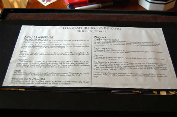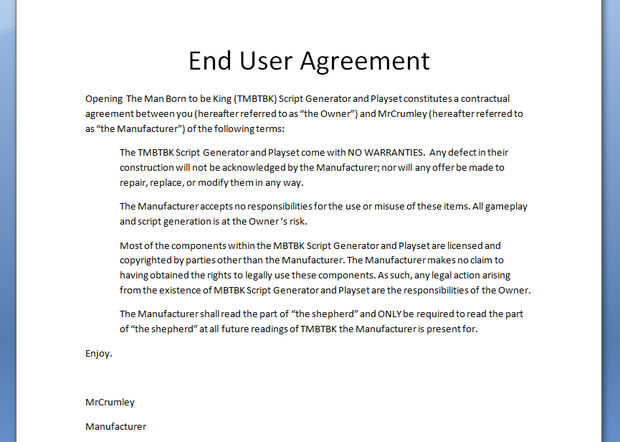 También, incluí un semi serio acuerdo de usuario final que establece que cada vez que participo en la lectura, sólo estoy obligado a leer la parte del pastor... que tiene una línea en el juego entero.
