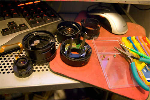 una vez han destornillado los tornillos micro, «debería» ser sólo una cuestión de girando suavemente el cilindro del objetivo, casi como si usted centra, hasta que se aparte. todas las partes internas de la lente salieron de la Asamblea de lente por vuelta o tirar suavemente de la manera correcta, con un micro tornillo sujeta una parte.