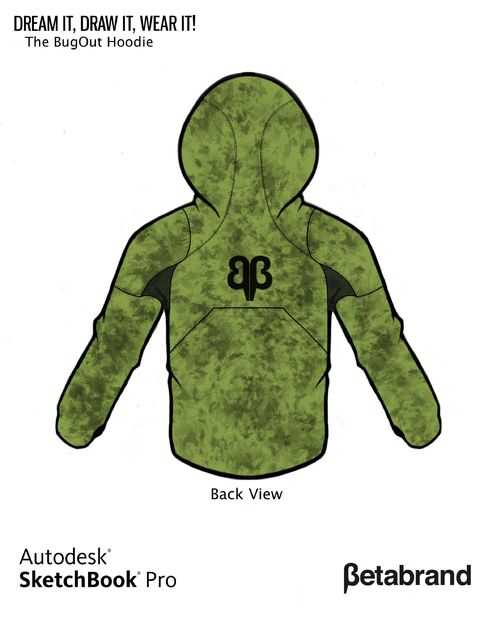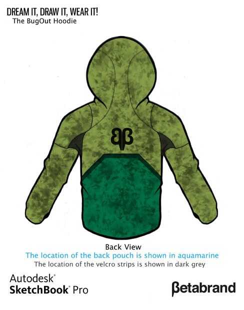 La parte posterior de la BugOut Hoodie sería diseñada con una bolsa trasera sujeta con velcro cosida. Permitiría que al portador de la sudadera la capacidad almacenar los elementos en la bolsa si es necesario.