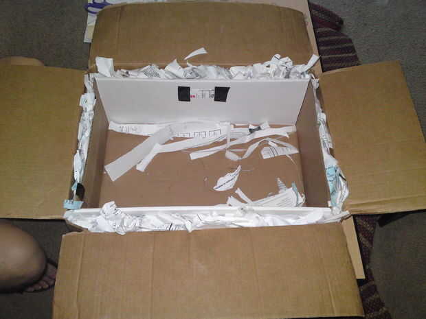 Asegúrese de que las aletas de la caja más grande no se doblan hacia adentro. Las tiras de papel fueron ligeramente arrugadas juntos y una generosa capa de aproximadamente 1"- 2" fue colocada en la parte inferior de la caja más grande.