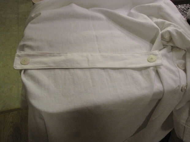 Ahora, tenemos que coser la banda posterior en su lugar. Poner la capa una vez más y apoderarse de ese amigo. Tienen el amigo perno de la banda posterior donde debe estar, ajuste la capa un poco por reunir el material en la parte trasera por debajo de ella. Asegúrese de que los extremos estén a una distancia igual a cada lado de las costuras laterales. Mina fue 1 1/2", pero cada persona es diferente. Cosido a la banda derecha a través de los botones, así que en caso de que alguna vez necesidad de alterado sería rápida de quitar y volver a coser.
