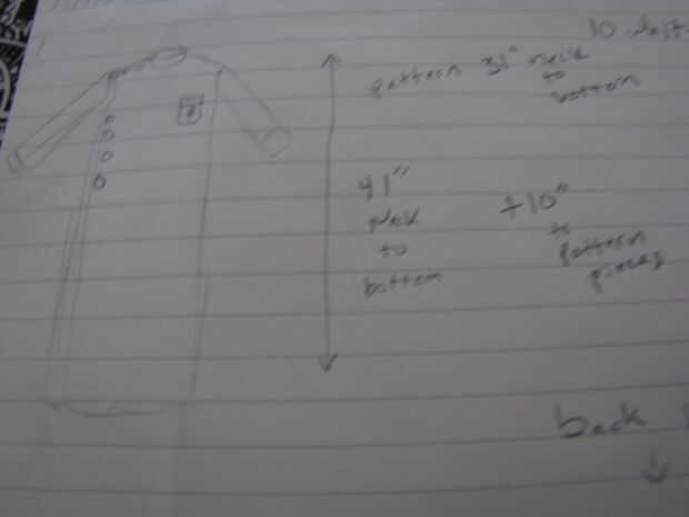 Vamos a ver cuánto tiempo más necesitamos la capa a ser. Será diferente para todos, así que es momento de recordar las variables. Compruebe la parte posterior del patrón para la medida 'de escote normal'. Encuentra tu talla y recordar ese número. Ahora, la medida de su escote para justo debajo de la parte posterior de la rodilla. Ahora, resta la medición que tomó de la medición en la parte trasera del patrón. Ese número va a ser x. Recuerde, anota, suelto no. Va a ser por cuánto tiempo necesita para hacer el patrón.