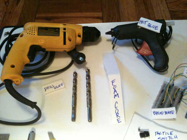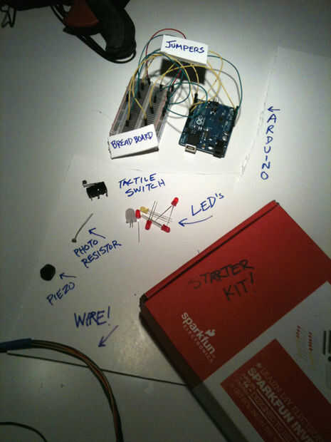Materiales: Núcleo de espuma (de lo contrario algo que bio-degradan un poco más de 10.000 años); VARILLAS DELGADAS; LED (en el kit); ALTAVOZ piezoeléctrico (en el kit); ALAMBRE eléctrico (< = 22ga.); INTERRUPTOR táctil (en la foto: no en el kit); Los cables de puente (sí, kit); Sin soldadura BREADBOARD (kit); FOTORRESISTENCIA (kiz-nit); RESISTENCIAS (kiiiittt); ODIO de platos sucios (innatas);