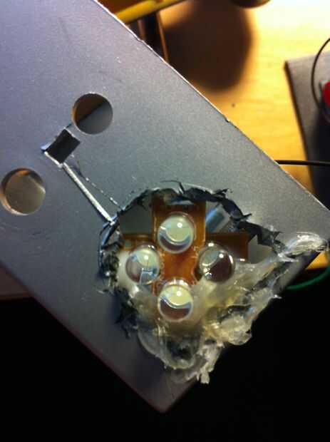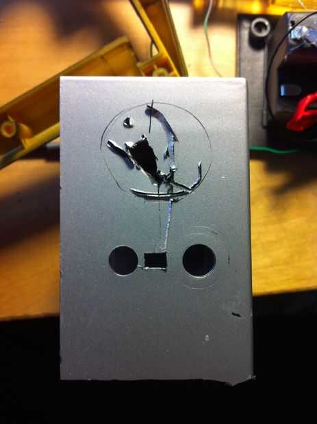 La parte siguiente consiste en modificar cuidadosamente el cuerpo de luz estroboscópica para luchar donde la munición va normalmente (gattling gun parte?). Primero tuve que recortar una media pulgada de la parte inferior de la cubierta y el mismo de todo el cuerpo. Utilicé unas tijeras de cocina fuerte. Theeeen tuve que cortar con cuidado un círculo perfecto por el lado de la caja a la altura de la abertura del cañón (esto hará más sentido con la pistola de nerf aparte... tal vez volver que deberíamos ir paso ahora, a continuación, volver). Después tuve mi Perfect Circle, había atascado el clúster LED en el agujero y me asegura con seguridad con pegamento caliente, podría decirse que el syrum hacker por excelencia, junto a quizás sólo WD40.