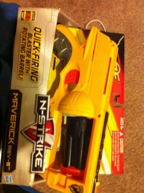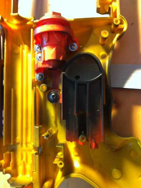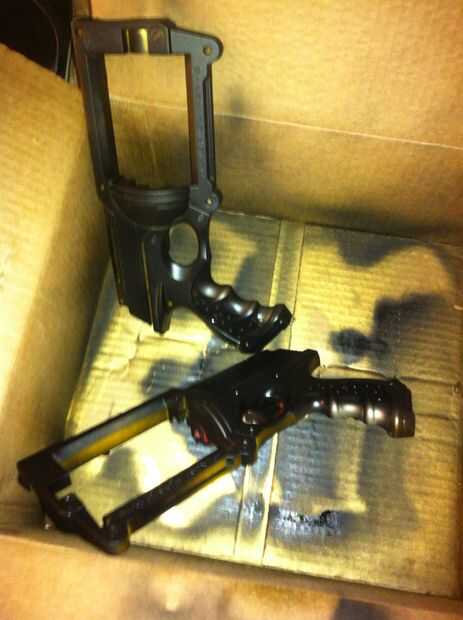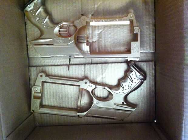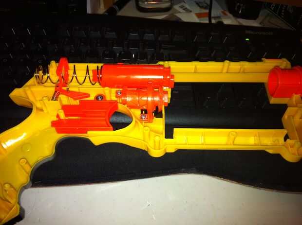 Vamos a desgarrar este chico malo! Tomar todos los tornillos que averigua y tirar de dos mitades separadas (no demasiado fácil, así que le dan algunos oomph). Tomar las tripas fuera del cuerpo excepto el gatillo. Les Flip en alguna cartulina y pintura de aerosol. Hice 3 capas; 1 oro, 1 negro, luego cuando ya estaba ensamblada hice un abrigo negro final. No se olvide el lado del tirón con el gatillo sobre y rociar el gatillo (no quiero que lo naranja en un lado).