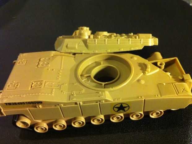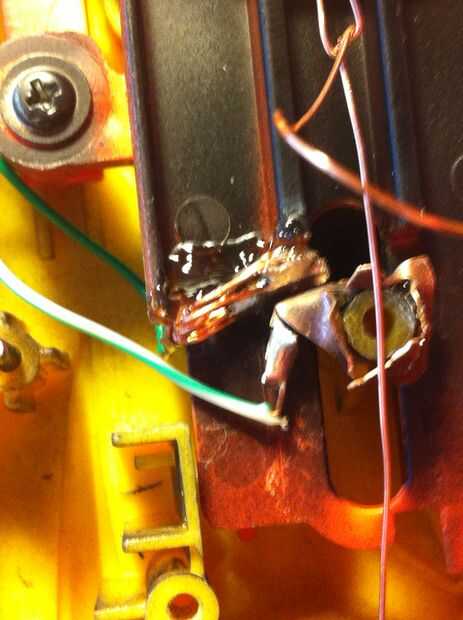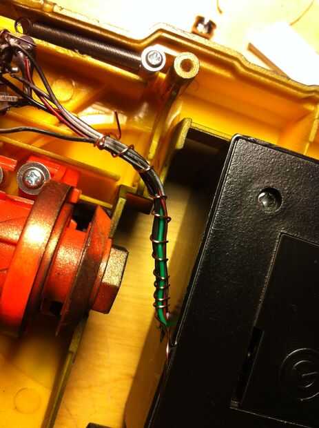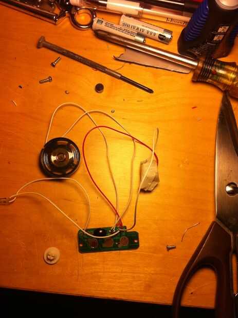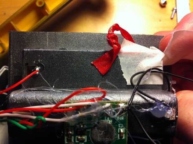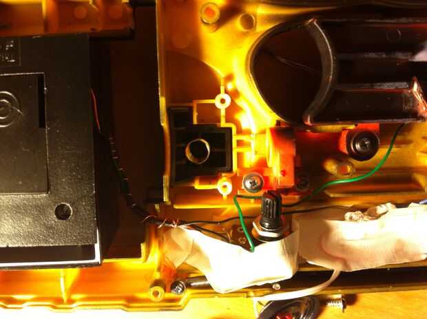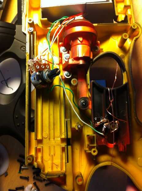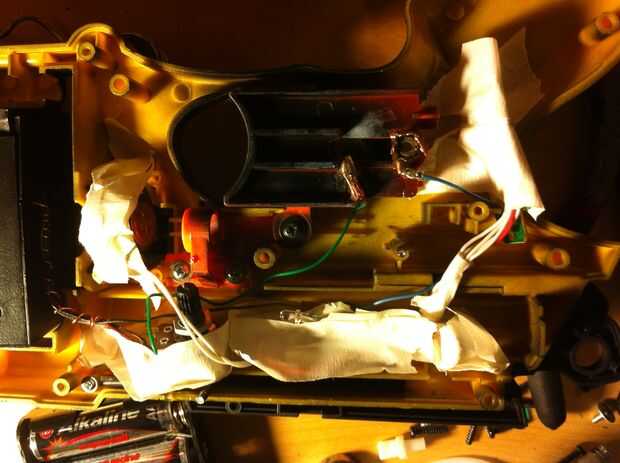 Time to get up in them guts. En primer lugar, conseguir todas las tripas en el cuerpo de la luz estroboscópica y súper pegamento a la parte superior de la pistola (ver la foto). Luego, asegure los contactos del dos gatillo; uno para el cargo que el gatillo está montado sobre y otro para el gatillo sí mismo. Usé pegamento porque soy duro como eso! ehhem... a continuación, alinee el resto de las tripas a lo largo de la baranda superior y asegúrelo con masking tape, cinta aislante, craploads de pegamento caliente, cualquiera que sea. Envuelve mis cables con un alambre de cobre para que se vea cool. Entonces tomé las entrañas desde el tanque de juguete (no instrucciones reales de aquí chicos, rasgar abierto, haz el circuito y los altavoces y soldadura de alimentación y tierra a los contactos en la parte posterior de la caja de la batería) y poner el altavoz hacia adelante bajo el cañón (foto).