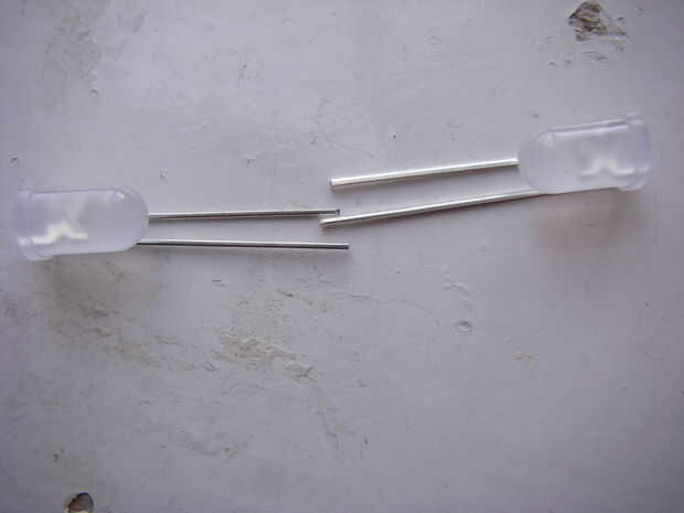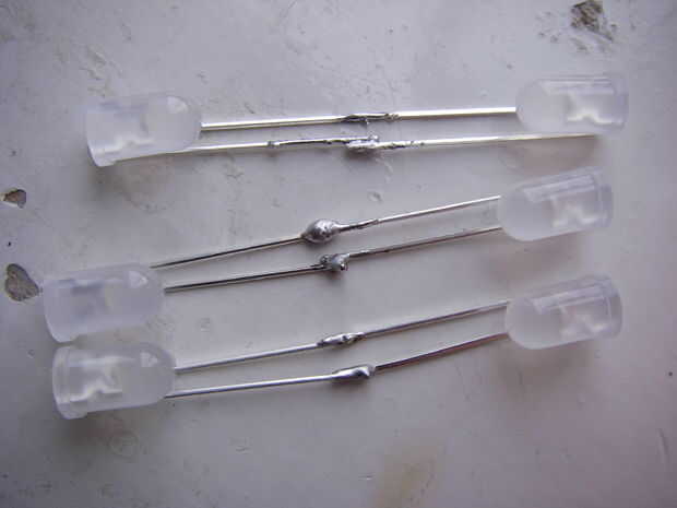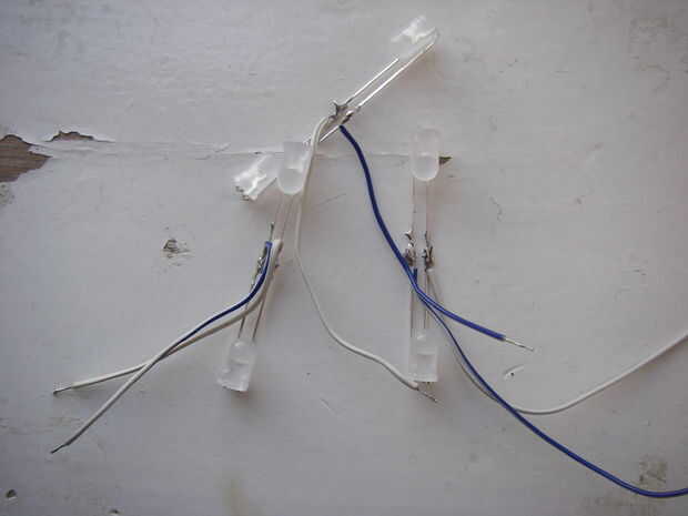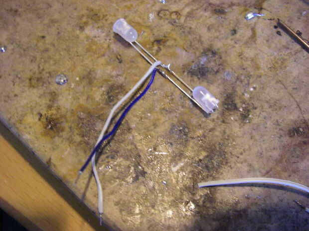 La soldadura de los LEDs y soldar algunos cables en los LEDs. Mueva su ratón sobre los cuadros amarillos para ver las instrucciones.