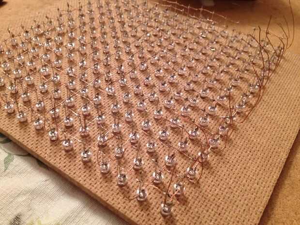 Repetir el proceso detallado en los pasos 5, 6, 7 y 8 con cada columna de LEDs con el cátodo restante conduce hasta que todas las columnas de la red están conectados. Es importante tener en cuenta que los cátodos deben cablearse superior hasta las puntas, de unos 3/4", con el fin de evitar cortocircuitos entre filas y columnas.