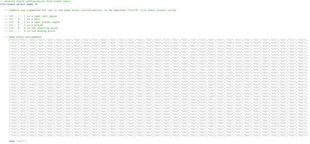 Los datos del laberinto se realiza en una señal que se llama 'laberinto', de tipo personalizado 'maze_type'. 'Maze_type' es un array de 2 dimensiones de los vectores de la lógica estándar de 3 bits. Cada elemento del array almacena los datos en el tipo de espacio en esa ubicación. Al acceder a la matriz, la dimensión Y se especifica primero.