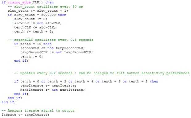 En el flanco ascendente de reloj, incrementos de slow_count. Cuando el reloj ha finalizado su ciclo 5 millones de veces, slow_count restablece, slowCLK oscila y décimo aumenta. 5 millones es elegido porque un reloj de 100 MHz se reloj que muchas veces en medio de una décima de segundo. Esto significa que slowCLK y tenthCLK tienen un período de una décima de segundo. Asimismo, secondCLK oscila cada medio segundo cuando x es igual a diez, lo que significa secondCLK tiene un periodo de un segundo.