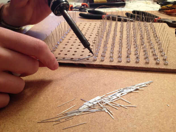 La soldadura de cada una de las conexiones de cada LED en esa fila. Asegúrese de hacer esto rápidamente, como los LEDs pueden dañarse si se expone al calor por largos períodos de tiempo. La hoja de datos en su LED debe tener información más precisa.