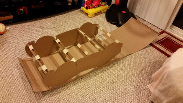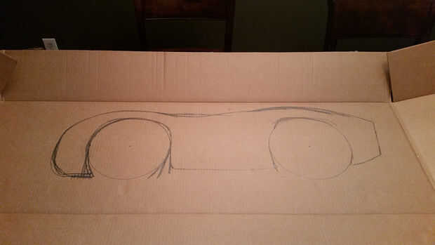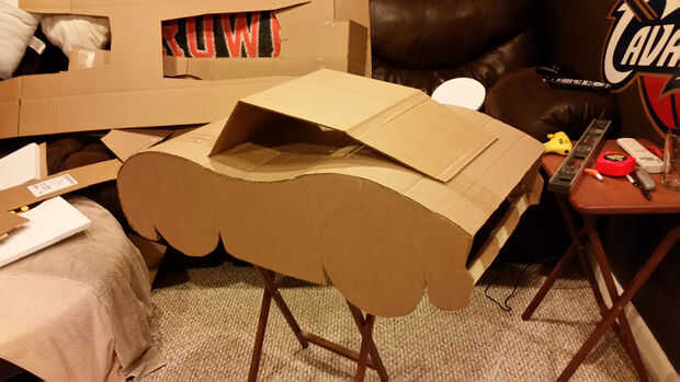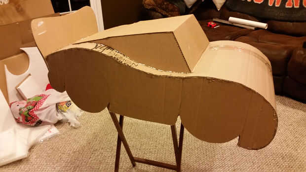 Para construir el coche, saqué el lado del coche en un gran y largo pedazo de cartón. Una vez me gustó cómo se veía, lo recorte y había utilizado como plantilla para el otro lado. Entonces creé 8 "soportes" de cartón, cortar a la longitud de mi anchura deseada del coche (más de unas cuantas pulgadas extras así que podía usar como fichas para pegar a cada lado de la tarjeta). Pongo varillas en dos de los soportes de la parte inferior/medio para proporcionar un poco más fuerza de lado a lado. Entonces tomó un trozo largo de cartón, cortar a la anchura del coche (más de 2 pulgadas) y enrollado alrededor de un 3" pedazo de chatarra PVC tubo descomponerlo un poco por lo que se curva. Utilizó esto como la "piel" del coche y poco a poco la había pegada en el borde superior de cada uno de los lados del coche. Corte la parte superior "cockpit" del coche, que incluye el parabrisas, techo y trasera "cristal" y pegado a la parte superior ("piel") del coche. He utilizado el coche sí mismo como una plantilla para recortar los lados de la cabina y pegados todos juntos. Luego dibujó y cortar el alerón y había pegado a la parte trasera del coche. Luego corté la boca y los orificios en la parte superior de la cubierta y a través de la "piel" del coche lo suficientemente grande para mi niño en. Finalmente terminé con la cartulina. Ahora en el fieltro...