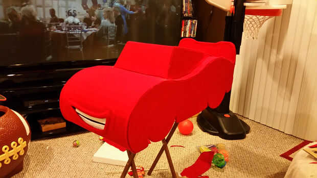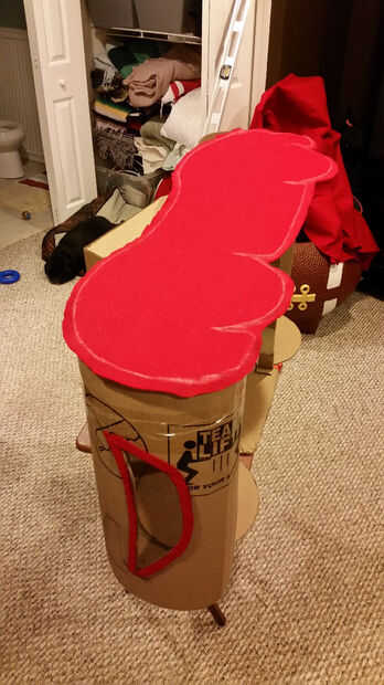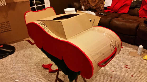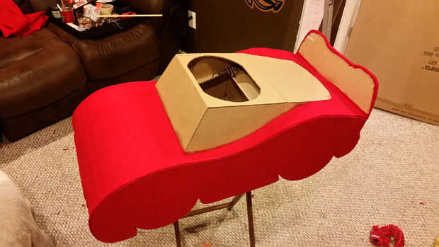 Empecé con la boca, especialmente los labios. Quería añadir cierta profundidad a la boca, así que cortar unas tiras pequeñas y pegadas en la parte superior para añadir esa profundidad. Luego se trasladó a los lados se sentía y el coche sí mismo usado como plantilla. Usé pegamento aerosol para unir todas las piezas grandes de fieltro para el coche y entonces laminado en los bordes y caliente había pegado abajo. Esto fue bastante mucho tiempo! Una vez que tuviera los lados y la parte posterior del alerón de fieltro, utilicé una técnica similar para sentir la parte superior como lo hice con la cartulina "piel". Tomó un poco de tiempo para hacer esa mirada derecha y corte alrededor de la cabina. Una vez que tengo que hacer, felted la cabina y la parte delantera del alerón. En este punto, el coche entero fue cubierto con fieltro rojo!... y parecía increíble. Me estaba empezando a sentir muy bien acerca de la mirada del traje, que era bueno porque estaba agotado...