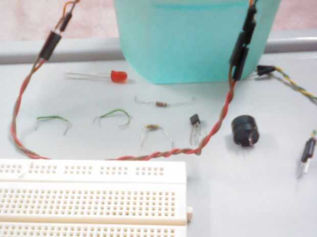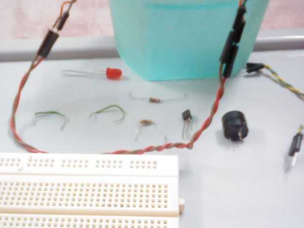 Hy, este es uno de mis proyectos favoritos porque es fácil de hacer y tiene un muy pocas cosas. Mente lo que no he inventado. Hizo con la ayuda de otros sitios Web. Como la corriente de la corriente de electrodos entre sí a través de agua y tierra se proporciona el transistor llega cargado y enciende el led o el timbre o lo llevas atado. Espero que os guste.