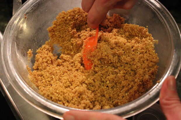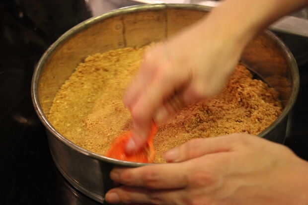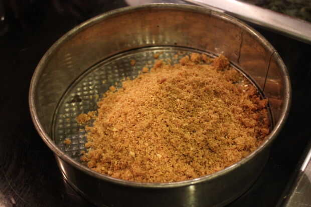 Bate o con un tenedor mezcle las migas de galleta, el azúcar y la canela. (La canela le dará un sabor agradable). Derretir la mantequilla sin sal en el microondas y usar un tenedor para mezclar la mantequilla con la mezcla de migajas hasta que estén todos se humedecen. Se verá clumpy y mucho más oscuro y es una buena cosa. Separó las migas en una sartén de forma del resorte de 9 pulgadas o una de 10 pulgadas placa de pie y presiónelas firmemente en una capa uniforme sobre la parte inferior y la mitad del camino hacia los lados de la cacerola. Hornear de 6 a 8 minutos o hasta que estén doradas. Dejarla reposar 8 minutos que se enfríe, o simplemente pegarlo en la nevera para ahorrar tiempo.