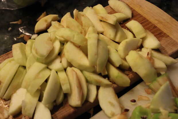 - 5 manzanas en pequeño granny smith. Deben ser pelados y quitado el corazón y cortarlas finamente (trabajo esclavo)
