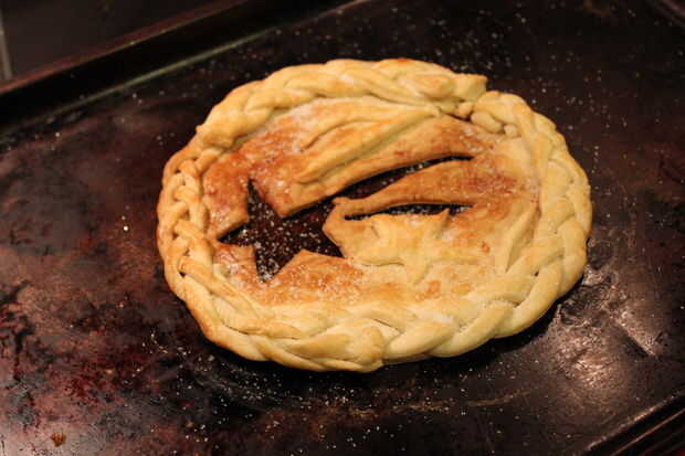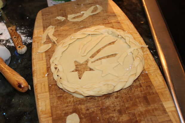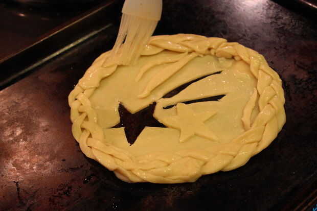 Cubrió con una clara de huevo para darle brillo y horneado junto a la tarta de queso durante 5-8 minutos.