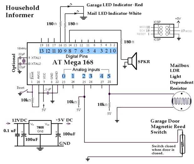 El diseño tiene dos sensores, el interruptor de láminas magnético de puerta de garaje y el Resistor dependiente buzón de luz (LDR).