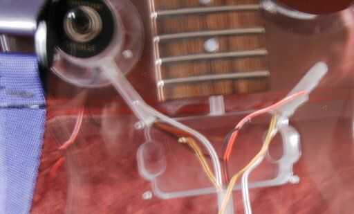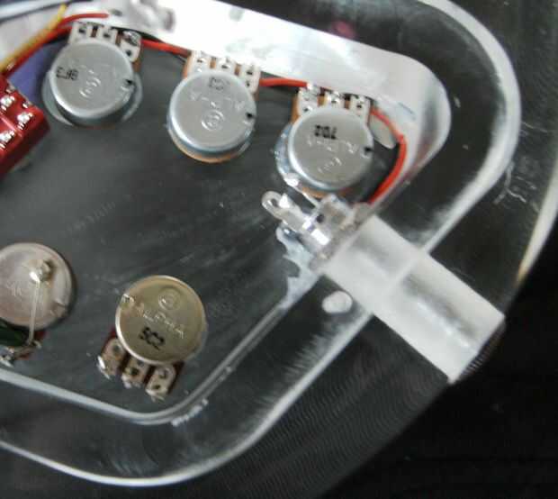 En la parte inferior izquierda no era ningún compartimiento para ejecutar una ruta en. Después de mucha deliberación he decidido taladrar un orificio de tamaño un poco más desde el fondo hasta me permite angular el led de abajo. Esto dio lugar a sólo un único conjunto de cables Enrutado fuera del cuerpo de la guitarra. Me encontré este donde el puente se sentaría a la cavidad de control, y unido a la parte posterior de la guitarra con algún celo claro. Que resultó para ser una solución elegante, sin embargo si quiero un acabado más profesional en el futuro voy a tener que moler alguna forma un surco poco profundo (una especie de router?) y rebajo los cables dentro, quizás cubierta con algo como transparente de epoxy.