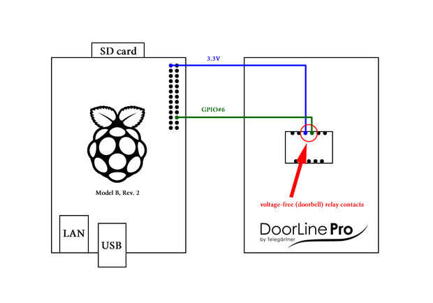 Esa es la parte fácil, teniendo en cuenta que no desea activar un timbre o una puerta huelga por el mismo relé: sólo tiene que conectar el 3c3 - y el pin GPIO 6 con los contactos del relé como se muestra en el esquema anterior.