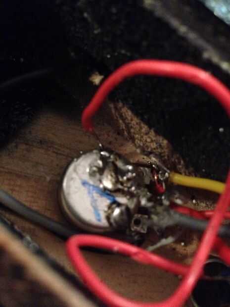Ahora toca los dos cables (no tienes que soldar el cable al interruptor porque el interruptor tiene agujeros en el Leeds. Ahora soldar las los alambres para el cable amarillo en el pote de volumen y el segundo directamente al volumen de maceta.